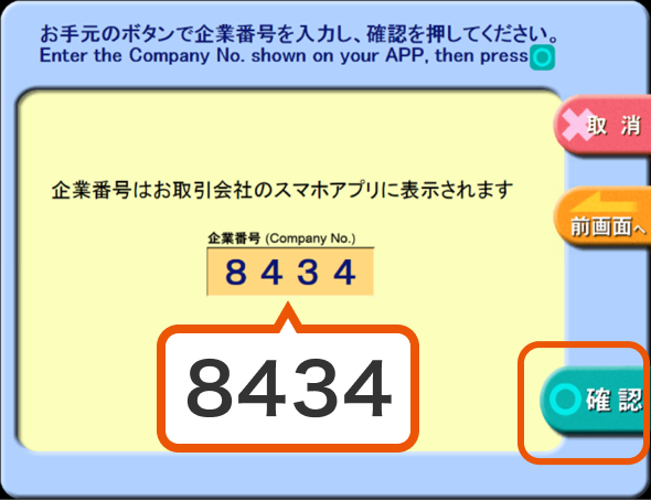 ローソン銀行ATMに企業番号「8434」を入力し、 確認を押してください。